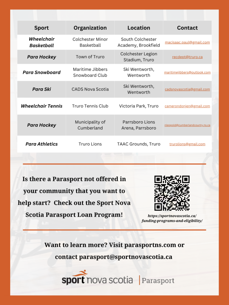 Is there a sport that you are interested in that isn’t listed above? Check out our Parasport Loan Program! Or are you interested in volunteering or supporting any Parasport programs in the Fundy Region? Contact parasport@sportnovascotia.ca to discuss!