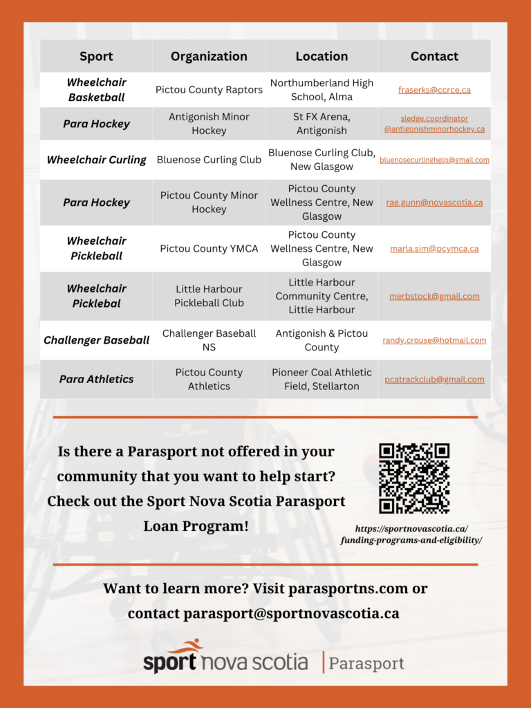 Is there a sport that you are interested in that isn’t listed above? Check out our Parasport Loan Program! Or are you interested in volunteering or supporting any Parasport programs in the Highland Region? Contact parasport@sportnovascotia.ca to discuss!